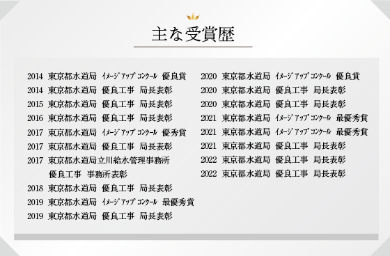 工事の発注元である東京都水道局より、「優良工事 局長表彰」や「イメージアップコンクール 最優秀賞」など数々の表彰を毎年受賞しています。当社のこの仕事に対する熱意と高い技術力が認められた証です。