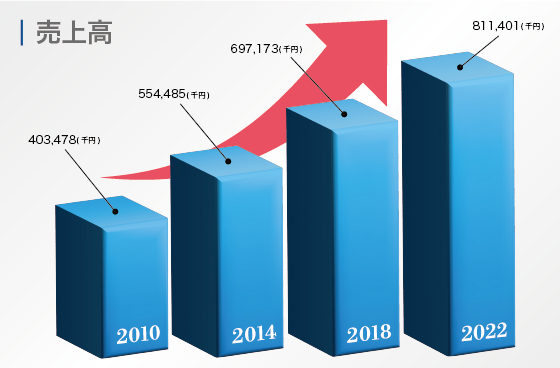 多摩地域を中心とした東京都内の水道インフラの新設・取替工事を東京都水道局より受注し、手掛けています。業績は非常に安定しており、2010年~2022年の12年間で売上高200%以上のプラス成長をしています。
