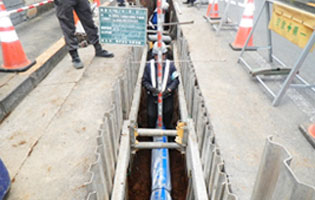 配水小管工事同様、老朽化した既存の水道管を、耐震機能を備えた新しい水道管へ取り替える工事です。口径400mm以上の幹線となる水道管を配水本管と言います。