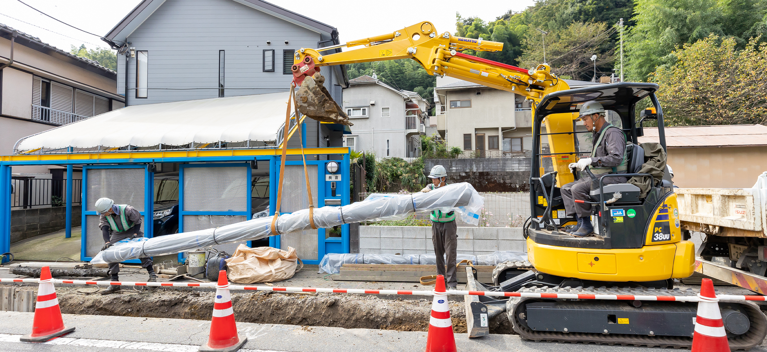 地下にトンネル状に掘削した穴に管を通して開削せずに管路を繋げる非開削工事です。掘削をしないので、騒音・振動などの周辺への影響を軽減できます。