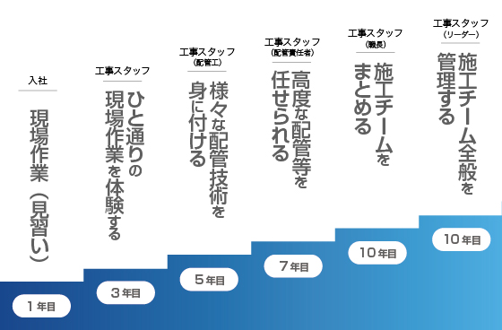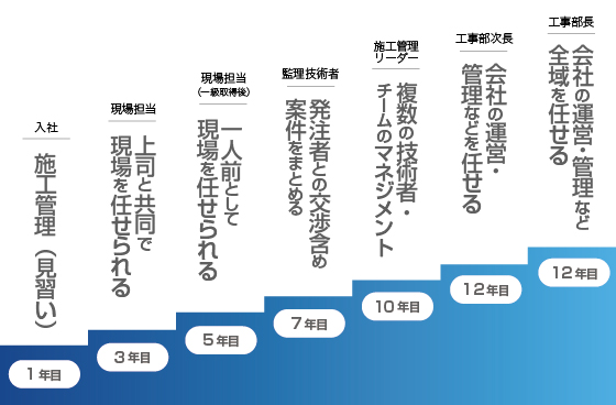 まずは見習いからスタート。上司と一緒に現場を担当し、5年目を目安に1人前として現場を任せられるようになるのが当社でのキャリアのイメージです(それまでの間に「1級施工管理技士」資格も取得いただきます)。スキルアップに合わせて給与もアップ。将来的には年収1000万円以上も目指せます。