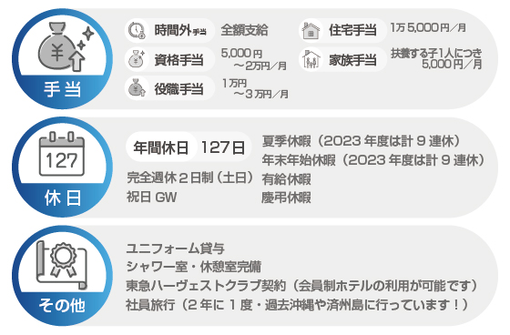給与は月給制・完全週休2日(土日祝)を導入しており、「雨で現場がなくなり収入が減る」といった事態は発生しません。また会社にはシャワー室や休憩室を完備。会員制ホテルが利用できる東急ハーヴェストクラブや社員旅行等の福利厚生も用意しています。